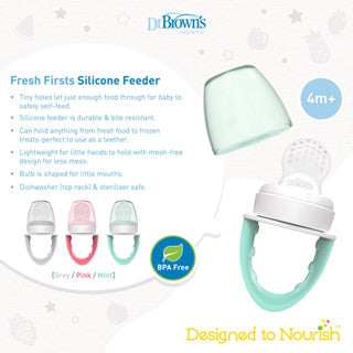 Tiny tastes, Fresh Firsts! Safely introduce baby to new food with Dr. Brown's Fresh Firsts Silicone Feeder.