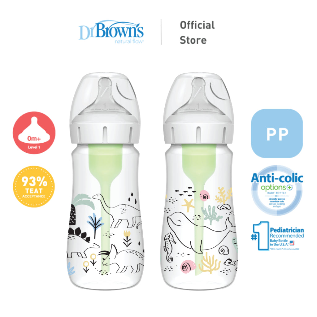 Dr. Brown's Anti-Colic Options+ PP Wide Neck 9oz/270ml Bottle, Multi Dino/Ocean Whale, 1 Bottle, Level 1 Teat
