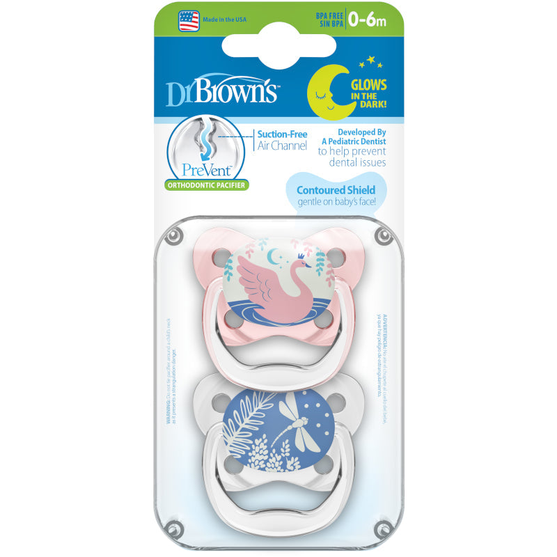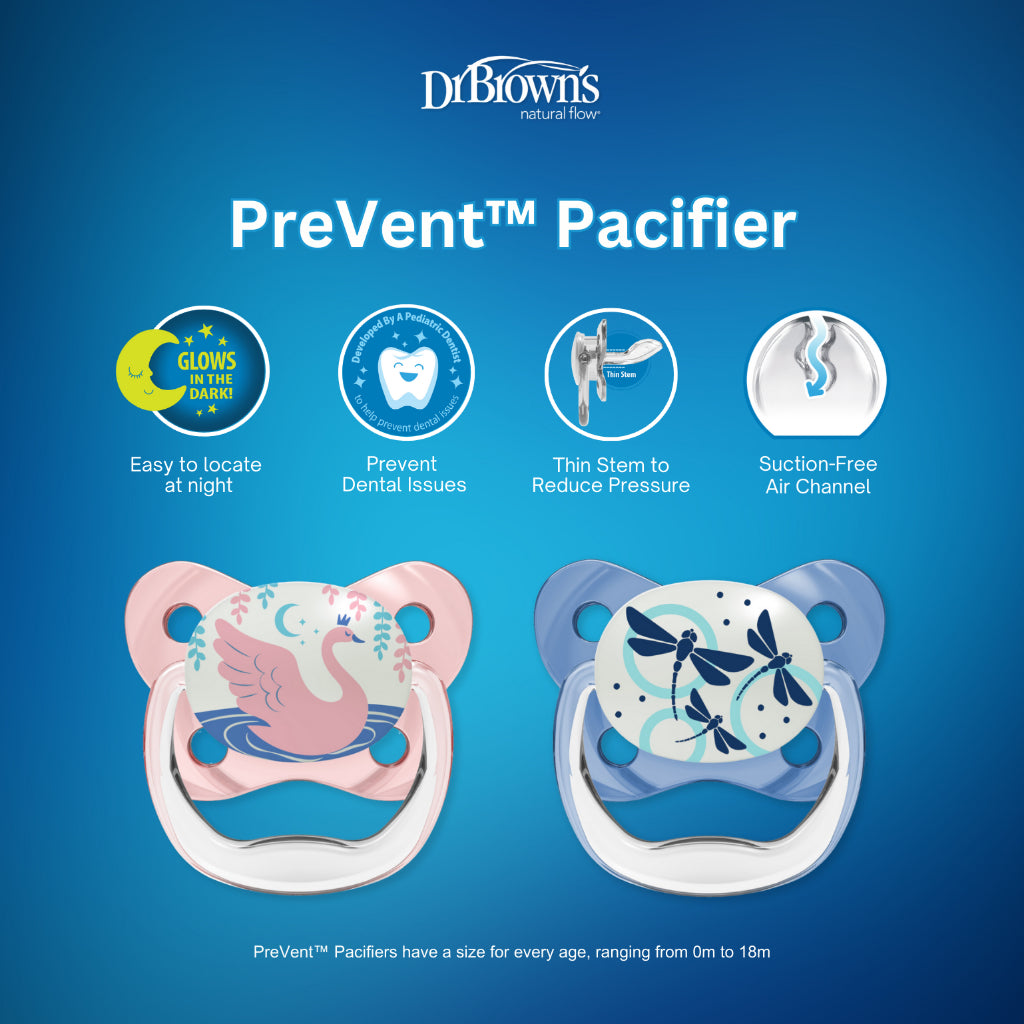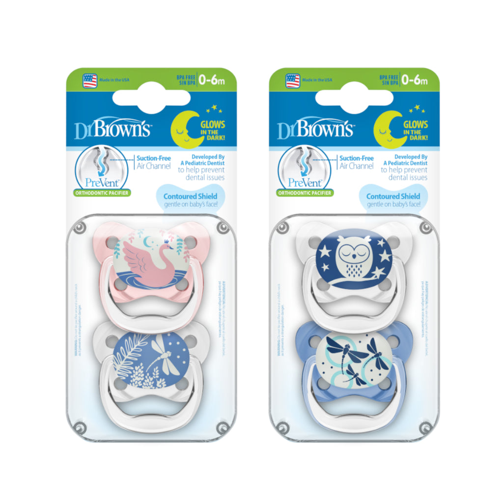 Dr. Brown's PreVent™ Glow in the Dark Orthodontic Pacifier, Stage 1 for 0-6months, Suction-Free & Breathable, Unisex, 2 Pieces