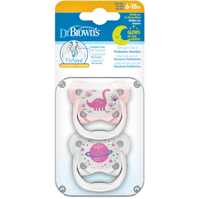Dr. Brown's PreVent™ Glow in the Dark Orthodontic Pacifier, Stage 2 for 6months+, Suction-Free & Breathable, Unisex, 2 Pieces